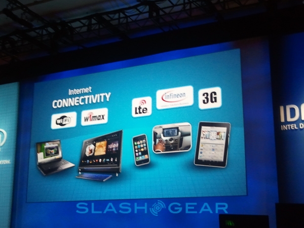 The company's WiDi or Wireless Display tech also got a name-check and an on-stage demonstration, with Intel showing a handheld tablet being used with WiDi to beam content onto a big-screen HDTV. Having acquired Infineon's wireless division, they also got a chance to namecheck the iPad among their "internet connectivity" push, while supported software environments included Linux, Google Chrome OS, Android, OS X, Windows and MeeGo.
