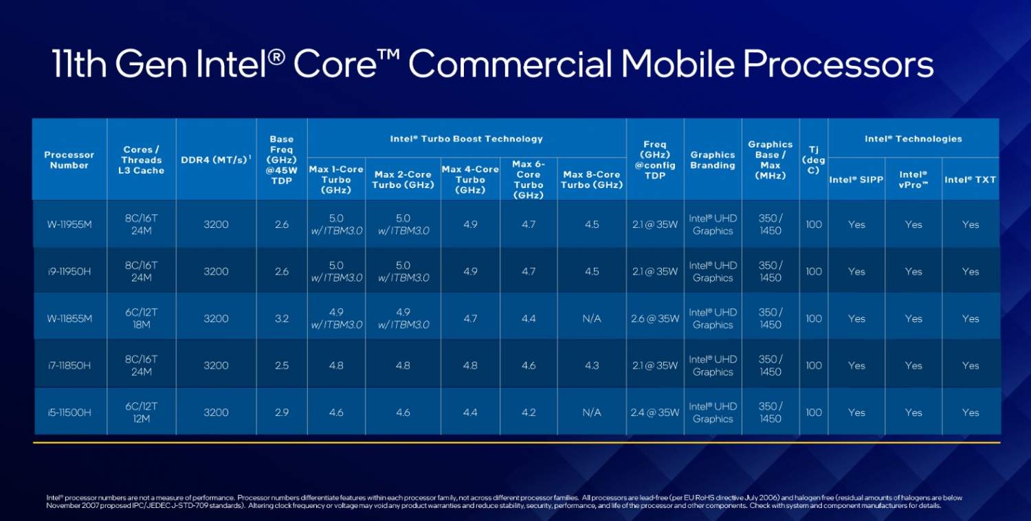 Intel also announced new vPro H-series processors today, with the 8-core Core i9-11950H as the flagship, along with the Xeon W-11000 series mobile processors. These are business-class CPUs that are being targeted at professional engineers, content creators, and data scientists who might need more raw computing power than average consumers and gamers, and they offer Intel's Hardware Shield AI threat detection to ward off ransomware and cryptomining attacks.