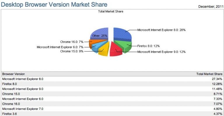 IE8 remains the top individual browser version in play according to Net Applications, at 28-percent alone, though those figures differ from those released in December by StatCounter which indicated Chrome v.15 had overtaken it. Google has begun an aggressive update push to get users onto Chrome v.16, and Microsoft recently revealed plans to automatically update its own legacy users unless they had previously opted-out.