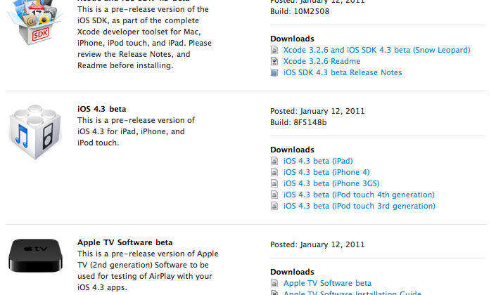 Details regarding the first beta for iOS 4.3 are still lacking, but we imagine that as more developers get their hands on the build, we'll find out more. If you're not signed up for the development program, you can still sign up and get your hands on the latest build of iOS through this link. If you're a developer and you're testing out iOS 4.3 right now, let us know what changes you're seeing in the comments below.