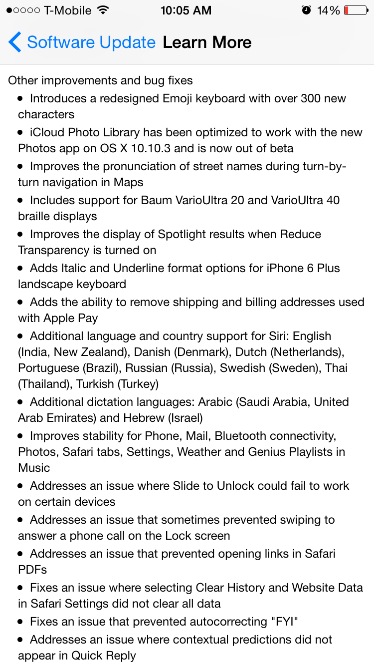 As stated above, some of the newness is complimentary of OS X 10.10.3. New emoji, WiFi fixes, and iCloud Photo library making good use of the new Photos app on OS X are in play, now.