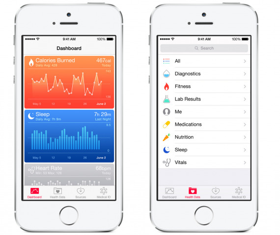 A new app will be available in iOS 8 called Health. This dashboard allows you to connect with fitness-related apps and, in turn, fitness wearable devices and/or the iPhone 5s' built-in abilities to monitor activity to keep yourself in tune. In this app you'll find Diagnostics, Fitness, Lab Results, Medications, Nutrition, Sleep, and Vitals.