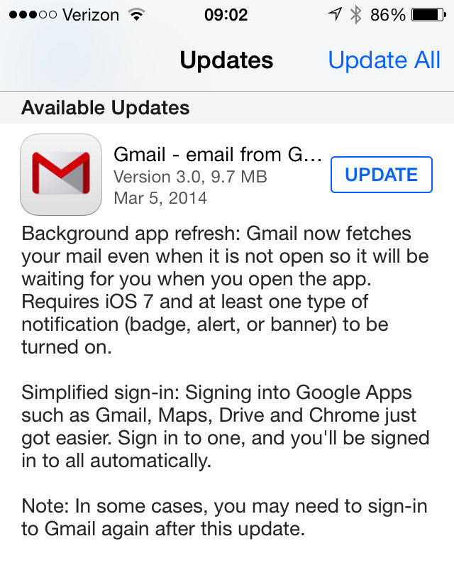 Google warns that users may have to re-login after updating the Gmail app, which is available now in the App Store.