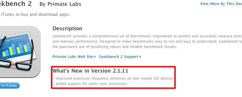 This updated version, however, could test iOS devices based on so far unannounced chips. It also tweaks the processor frequency detection on late-model iOS devices, something which could be more important should Apple use a chipset with asymmetric ARM cores that can each be run at different speeds depending on overall load, something which is used to reduce power consumption.