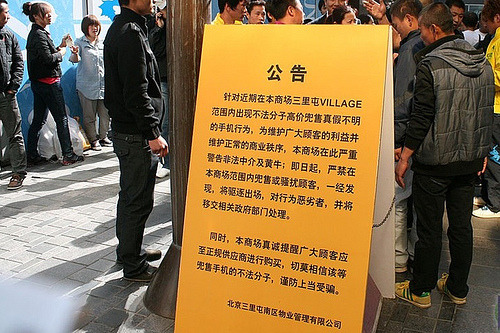 Apparently the scalper presence is so commonplace over there a large yellow sign board was erected with the following message (translated by M.I.C. Gadgets):