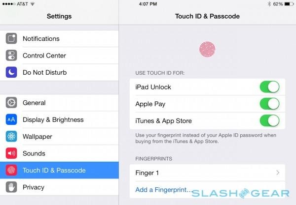 The system is effectively the same as on the iPhone 6, with the ability to register up to five fingerprints and have them unlock the iPad Air 2. With iOS 8, those fingerprints can also optionally authorize iTunes, App Store, and iBooks purchases, as well as give the green light to the new Apple Pay payments system.