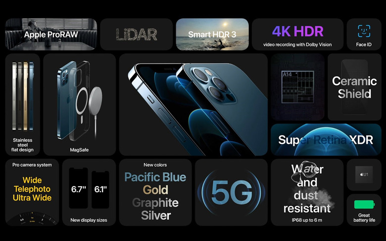 The iPhone 12 Pro Max has an A14 Bionic chip inside with a next-generation Neural Engine, IP68 splash, water, and dust resistance, and a 0.29-inch (7.4mm) thickness. But those features are the same in the rest of the iPhone 12 lineup. As Apple's new smartphone family releases go, this has to be one of the most "they're pretty gosh darned similar" selections we've seen.