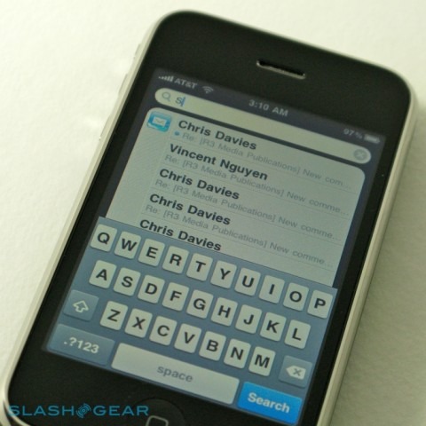 Two other significant improvements from OS 3.0 are Spotlight and Push Notifications. The former is Apple's response to universal search, and is certainly thorough; it bests Palm's Pre search by covering email – both on-device and on the server – notes, contacts, calendar entries and applications. The downside to all that content is that, once you have your list of results, you then need to tap them and go into their respective app to actually do anything. Not so bad with emails and notes, but there's no way to call a contact directly from the search results, for instance.