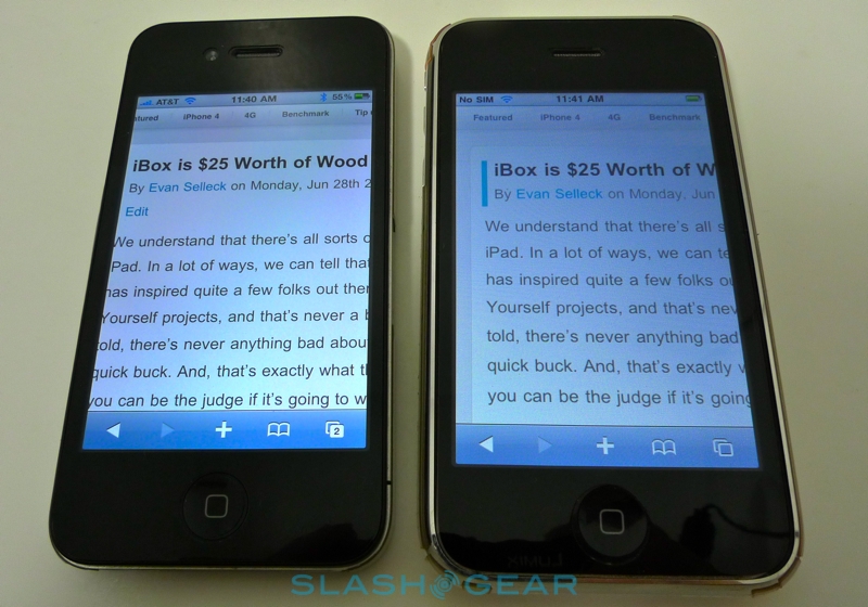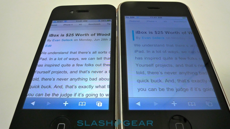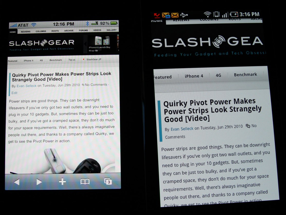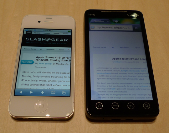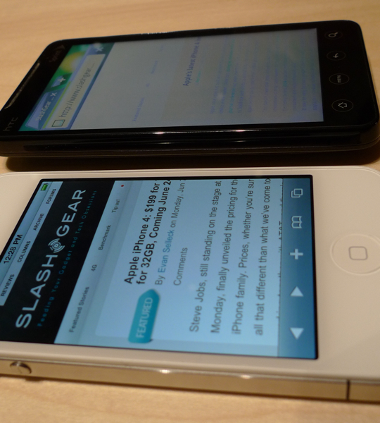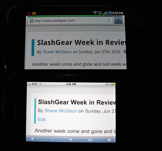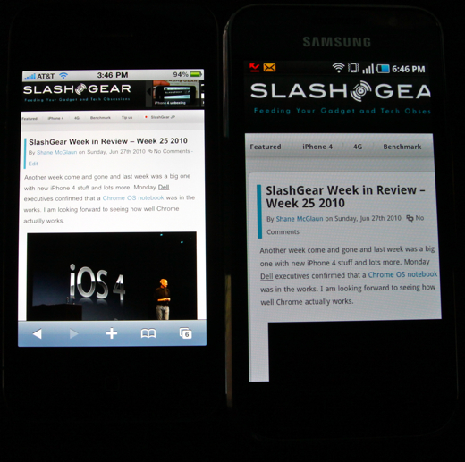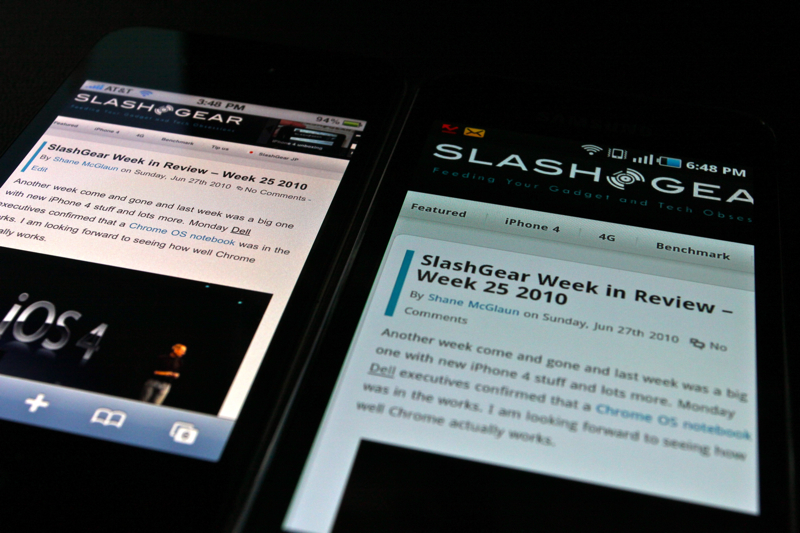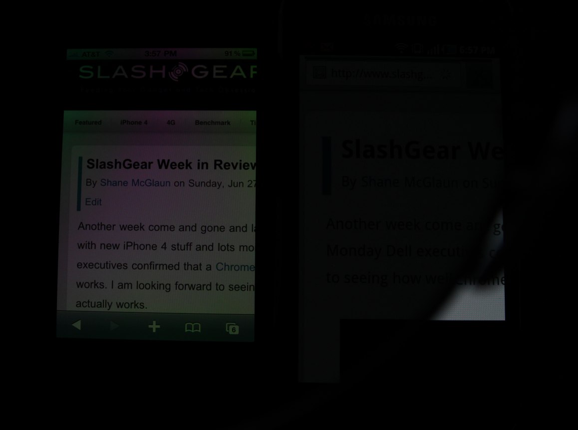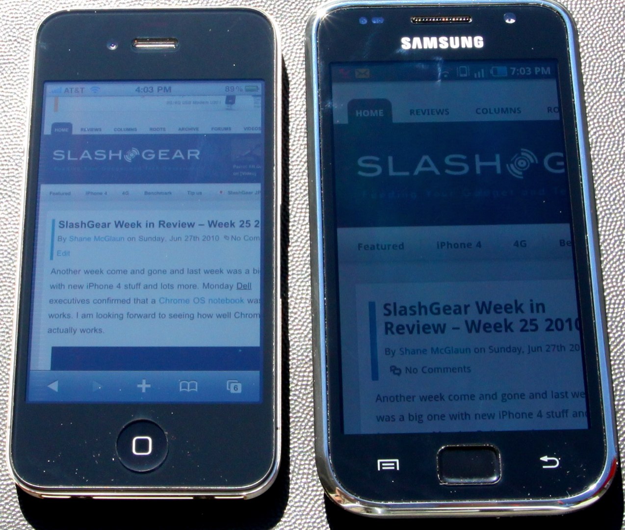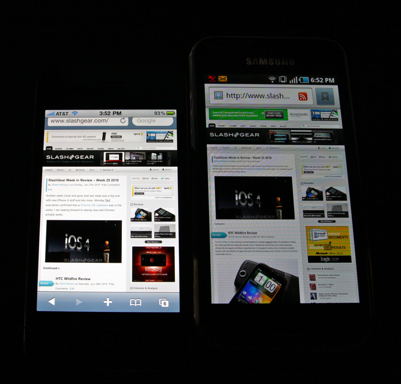 iPhone 4: 3.5-in Retinal Display (below) vs. Samsung Galaxy S: 4-in Super-AMOLED (above)