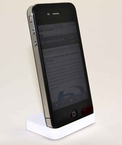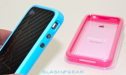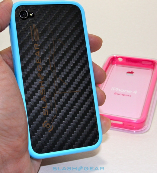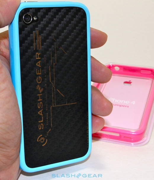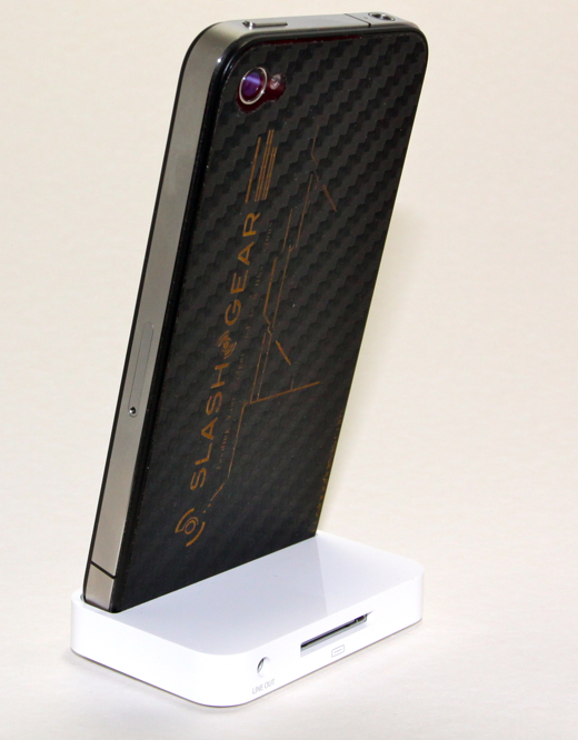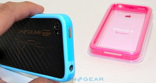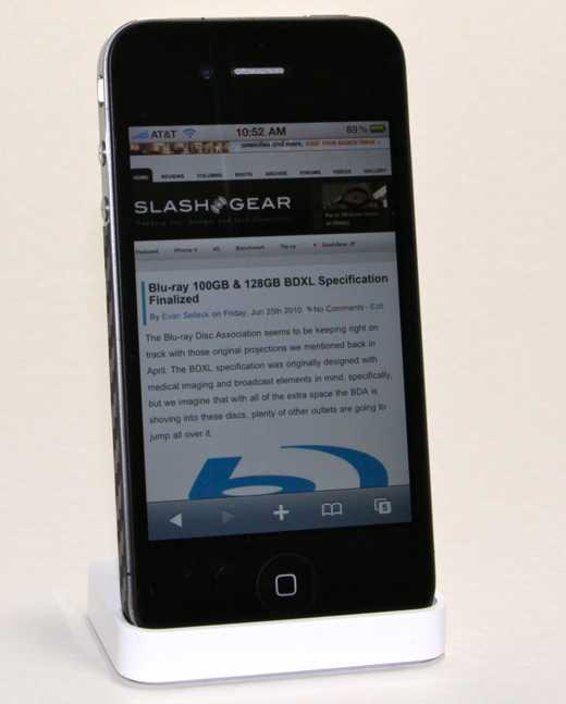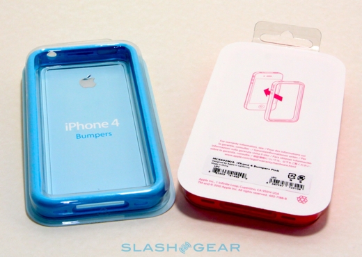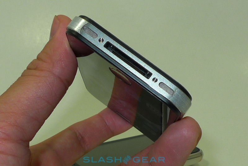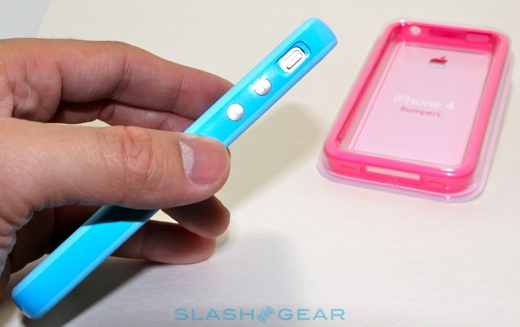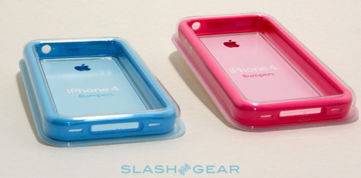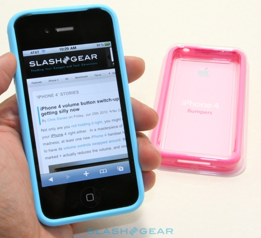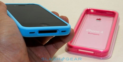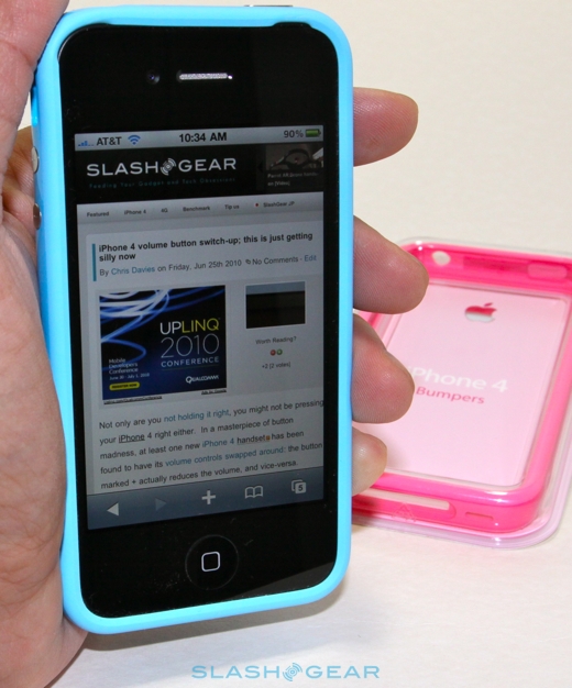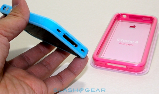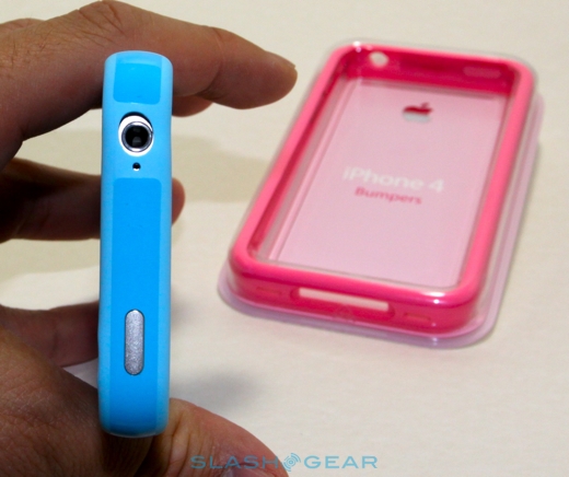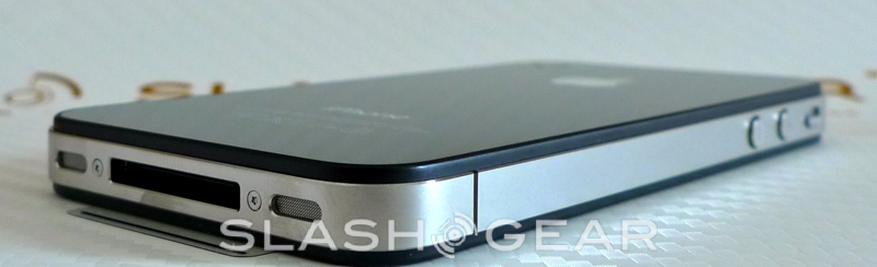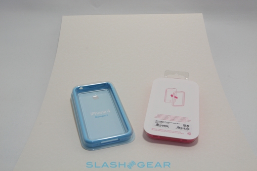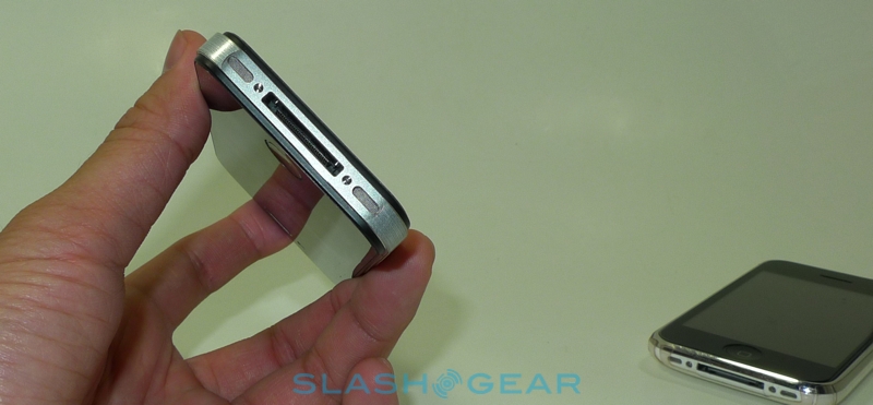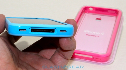 As for accessories, we've been trying out Apple's iPhone 4 Dock which – as you might expect – works to charge and sync the smartphone, and also has a 3.5mm audio output for hooking up to your stereo. Thanks to the change in case shape, however, you won't be able to use a 3GS in the dock, even though the Dock Connector port is the same. The official Bumper, meanwhile, is more a rubber band than it is a true case: both the front and back are left entirely exposed, with the Bumper stretching around the stainless steel band alone. In a neat touch, the Bumper doesn't just use cut-outs for the volume and power buttons, but actually has integrated metal keys that press the true buttons underneath. We're not entirely sure how much protection it will give, but given they cut out any reception issues based on how you hold the iPhone 4, we can see Bumpers being a popular accessory. They and the iPhone 4 Dock are $29 each.