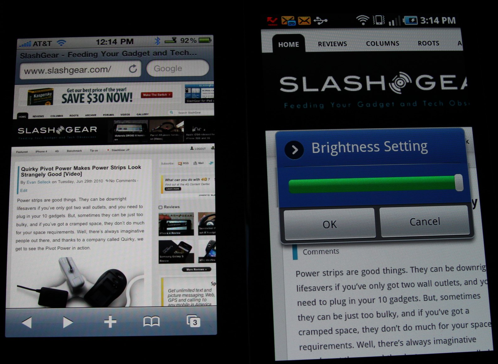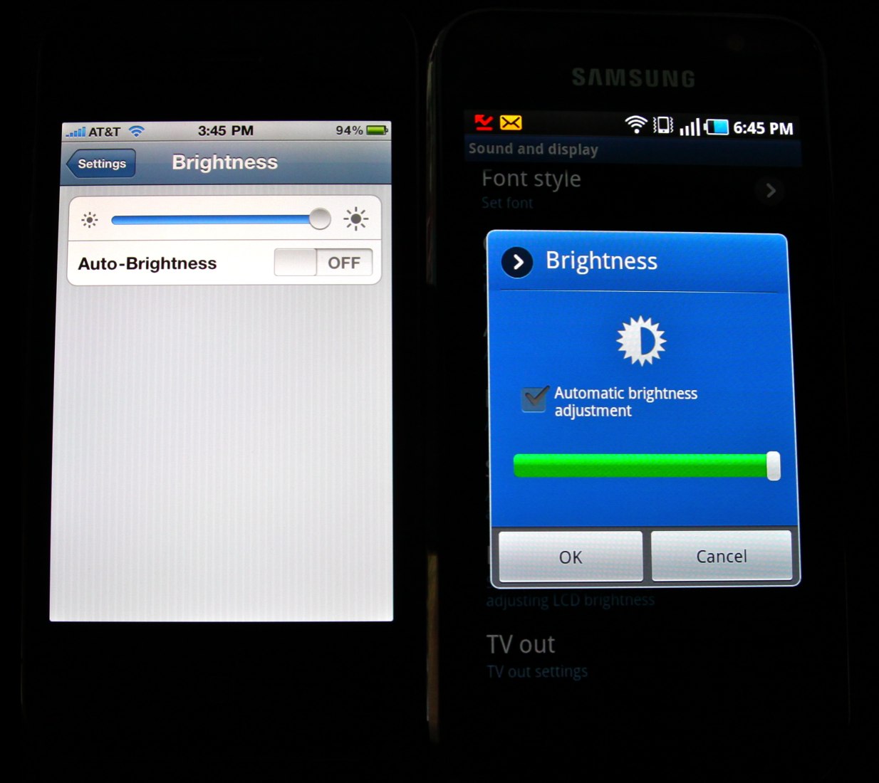 Galaxy S brightness still falls short of iPhone 4's Retina Display.