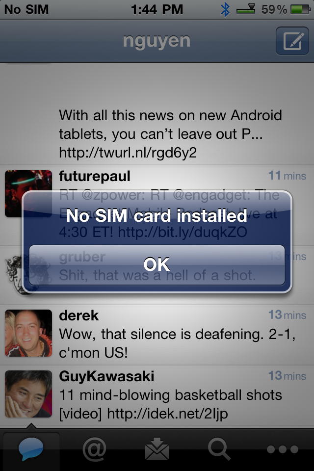 No matter the changes, AT&T's network continues to frustrate. We've suffered multiple dropped calls in every day of iPhone 4 use with the US carrier, and as before there's little apparent connection between what's shown in the status bar and what the network is actually capable of sustaining. Even more frustrating, perhaps, are the recurring "No SIM" errors in which the iPhone 4 and the AT&T MicroSIM seemingly become bored and stop responding to each other. We're not sure whether it's an Apple hardware issue – we're seeing similar reports from multiple people, though predominantly in the US – or something to do with the carrier's systems, but either way it demands a power-cycle before the two play nicely again.