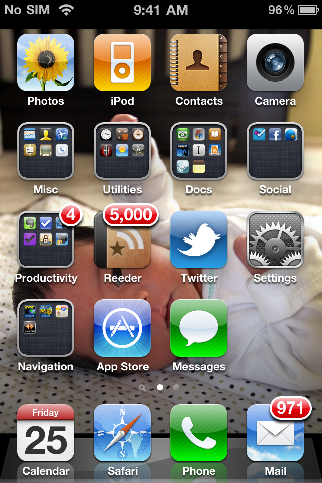 With the App Store now containing in excess of 200,000 titles, homescreen folders are ironically more useful than they sound. Drag any app icon onto another and a folder is automatically created, named by default according to the app's category, but open to user customization too. Go heavy on the organization and you can quickly slim down 10+ full homescreen panes to just a couple of screens of folders. Curiously, though, Apple has limited each folder to just twelve apps, and there's no support for nested folders: putting in a sub-folder to separate out, say, card games from your gaming folder.