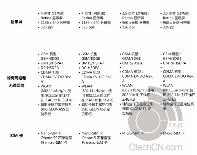 The information also confirms last week's rumors of a fingerprint scanner present on the iPhone 5S, although there is no new information about that. The sheet does make a claim of about 250 hours of battery life on standby, which is quite impressive, at least on paper. There is also mention of supporting China Telecom's CDMA EV-DO Rev. A network, which will probably hear more about after the exclusive Chinese press event on Wednesday.