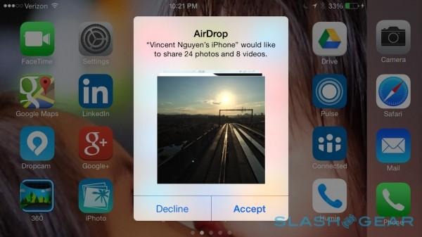 i was able to quickly copy over a folder of documents from Mac to iPhone 6 Plus for reading on the go, and then swap over a selection of photos and videos I'd captured when I got back to my desk. No cables, no passwords, no cloud intermediary: AirDrop just worked.