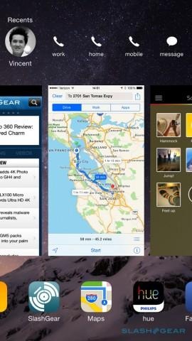Spotlight searches, meanwhile, take a leaf out of OS X Yosemite's book, and now include Wikipedia articles, recent news reports, and places you're nearby in the results. The multitasking view now includes a row of shortcut icons above the app windows, allowing you to jump straight into the contact details of the people you communicate most frequently with: if you generally call them, then you'll see quick-dial buttons when you tap their icon, whereas if you more commonly use Messages then that will be among the options instead.