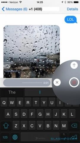Tap and hold the microphone button to the right of the message box and you can record an audio clip; sliding your thumb up and releasing sends it. When you receive a message, you can either press the play button to hear it out loud, or lift the iPhone 6 to your ear to hear it privately.