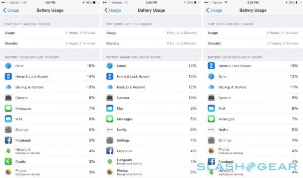 In practice, with mixed use, I got more than a day of use on a single charge from both models. That includes push-email, instant messaging, using the camera for stills and video, browsing in Safari and using Apple Maps, a few phone calls, and some streaming audio and video.