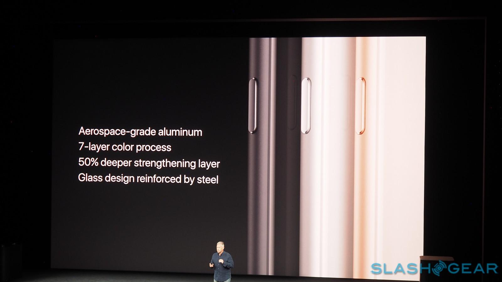 Phil Schiller showed the devices to the audience this morning in a dazzling display of glass. The vast majority of the detail comes in the glass backsides of this device – though the aerospace-grade aluminum has some real kick to it. The glass design is "reinforced by steel", said Apple, and the coloring is a 7-layer color process.