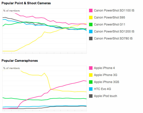 This is the first time (in recent history at least) that a smartphone has taken the top spot from the Cannons and Nikons of the world, a wakeup call for the point and shoot / DSLR / every camera-only device in the world to be sure. When you take a look at the Popular Point & Shoot Cameras chart you'll notice that not only are they ALL Canons, they're all evening out, this chart (and the others) showing the % of members on the site. This means that the cameras being used by members of the photo-centric site are fragmenting, while what these other charts are showing us is that Apple and their tight relegation of models of devices, (aka one smartphone to rule them all: iPhone,) is more than a powerful message to the rest of the non-smartphone handheld device world.