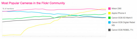 There are certain statistics every good camera or camera-toting device group pays attention to, one of the more unassumingly important set of these being on Flickr's own most popular cameras page. This page is an extremely simplistic look at which devices are attached to photos the most often in the Flickr community, graphs broken down into Point & Shoot, Cameraphones, and the cross-breed Most Popular Cameras overall over the past year of Flickr action. What we're seeing today is that longstanding king of Flicker photos, the Nikon D90, has been ousted and replaced by the rapidly growing iPhone.