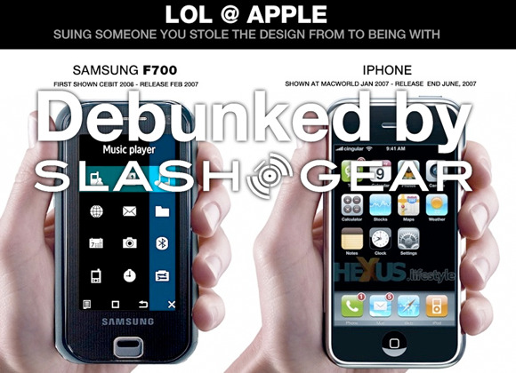 The following image has been circulating the internet for the past few days, resulting in mass hysteria due to the fact that Apple is currently suing the pants off of Samsung for infringing on their copyrights. This image appears to show that the Samsung F700 was first shown at CEBIT 2006 and released in February of 2007. What whoever made the image didn't take the time to do was check their facts and find that although Samsung may have spoken about advancing their cell phone plans previous to 2007, they only showed the F700 design for the first time February 8th, 2007.