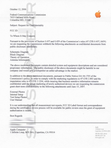 Then there's the following image, a letter from Apple to the FCC requesting that they keep hidden their documents that ended up being for the iPhone – October 12th, 2006: