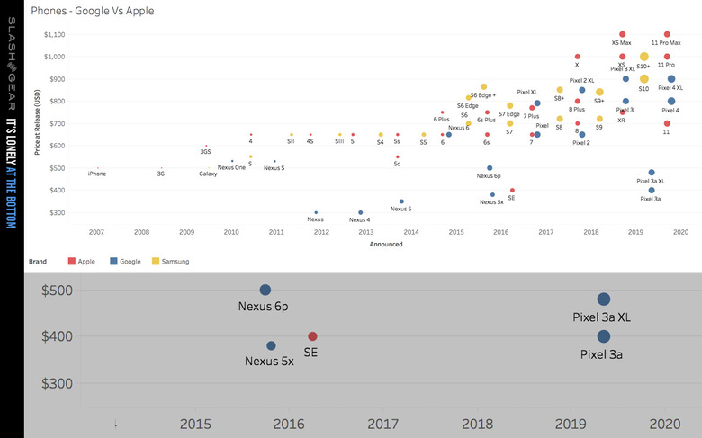It's been suggested more than once that this new iPhone SE 2 will cost approximately $399 USD. That'd fit right in with the chart for price spread right now – replacing the iPhone SE and standing firm against the Google Pixel 3a (and eventual Pixel 4a, also from Google). The chart below comes from creator Ben2001!
