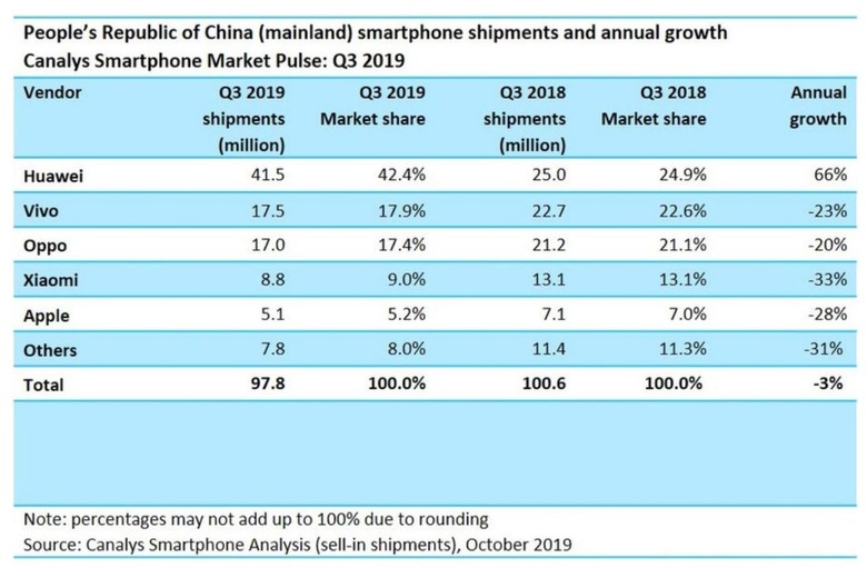 Canalys' figures showed that Huawei's shipments grew by as much as 66% compared to the same third quarter in 2018. It now holds almost half of the Chinese smartphone market at 42.4%. Everyone else, including fellow Chinese companies Vivo, OPPO, and Xiaomi, took a backseat. Samsung, the global smartphone leader, was nowhere to be seen.