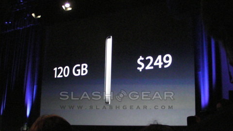 First, the iPod Classic is changing. The new 120 GB model is replacing the 80GB and the 160GB is being discontinued. You will be able to hold up to 30,000 on this new model, which is the same as the Microsoft Zune, Jobs points out, and it will cost you $249. Just like the Zune, too.