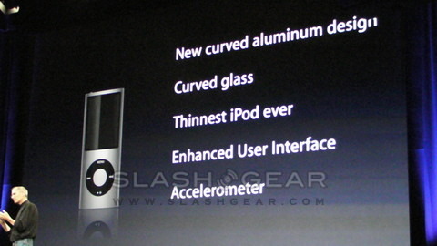 The iPod nano refresh, however features the "much loved" form factor of the 2nd gen model with the 3rd gen's ability to play video. It has the same height as the 2nd gen nano and Steve says "You will be blown away by how thin it is." With an aluminum casing with curved glass, this nano gets an accelerometer as well.