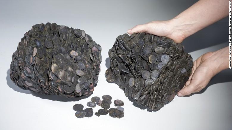 In addition to statues and pieces of statues, the team found large clumps of ancient coins that had fuzed together into two large masses, the total of which weighed about 40 pounds. According to the IAA, these coins have the visage of Emperor Constantine on them, while other have images of Licinius, his rival.