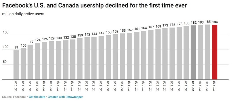 Above you'll see a chart created with data from Facebook's Q4 2017 earnings report made into a bar graph with DataWrapper. This is a chart showing millions of daily active users, specifically. That's an average, whereas the monthly active users number continues to grow relatively steadily.