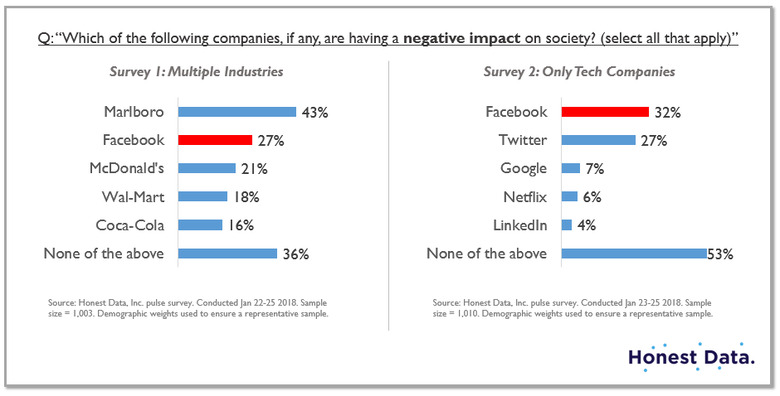 You'll notice that Marlboro is the only cigarette company on the list in the first sample, so it's kind of difficult to put any of these other companies ahead. When the study asks about a negative impact on society with a list of only tech companies, Facebook is the clear winner. It's followed relatively closely behind by Twitter – another massive social network.