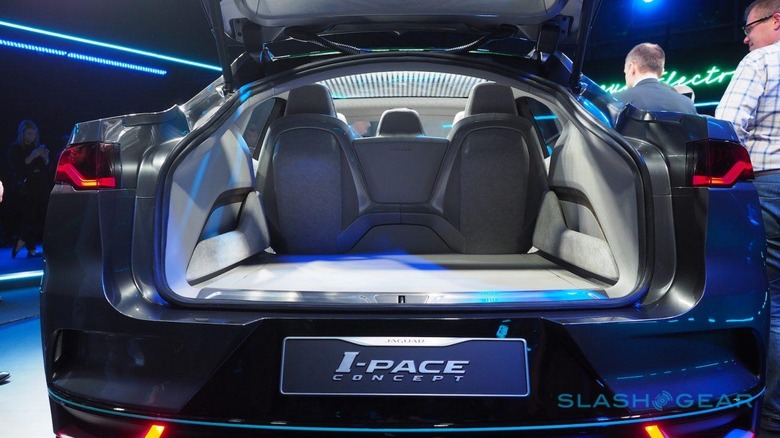 It still leaves space for a 18.7 cu-ft. rear trunk, along with 1 cu-ft. of front trunk (or "frunk") space, which Jaguar expects I-PACE owners to use to store their charging cords. They'll plug into a hatch on the front passenger-side wheel arch; the concept car has five LEDs to show current battery status from afar.
