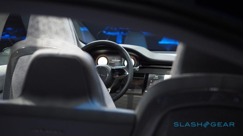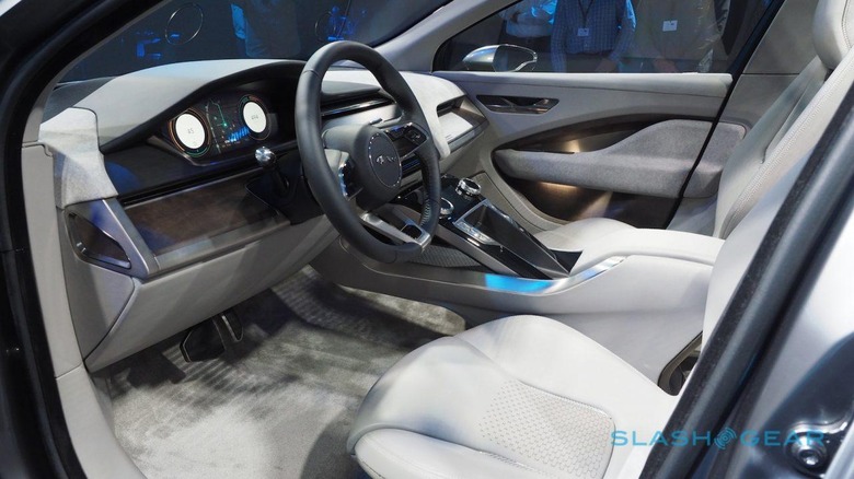 On the outside, the F-PACE similarities are clear, though plenty of the detailing is inspired by Jaguar's far more striking C-X75 concept supercar. A strong, high shoulder-line emphasizes the muscular arches – helped, of course, by the vast wheels shod in custom rubber – while the sharp angle of the rear hatch cuts into luggage space in the name of style. It's almost five inches shorter than the Model X, too.