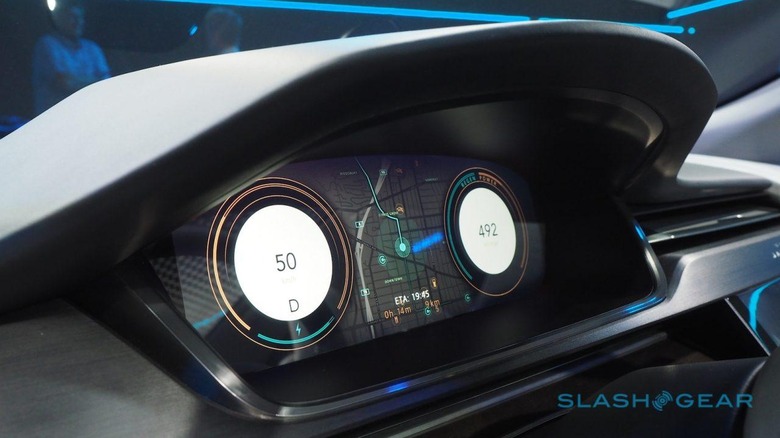 That means pushing the front seats forward, increasing rear legroom for five adults without cutting into the trunk. Since there's no engine in the front, nor a drivetrain running through the center of the cabin, the "cab forward" design can echo that of mid-engined sports cars, maximizing interior space. Design elements like a suspended dashboard, floating without any floor supports beneath, that flows into a similarly cantilevered center console emphasize the effect.
