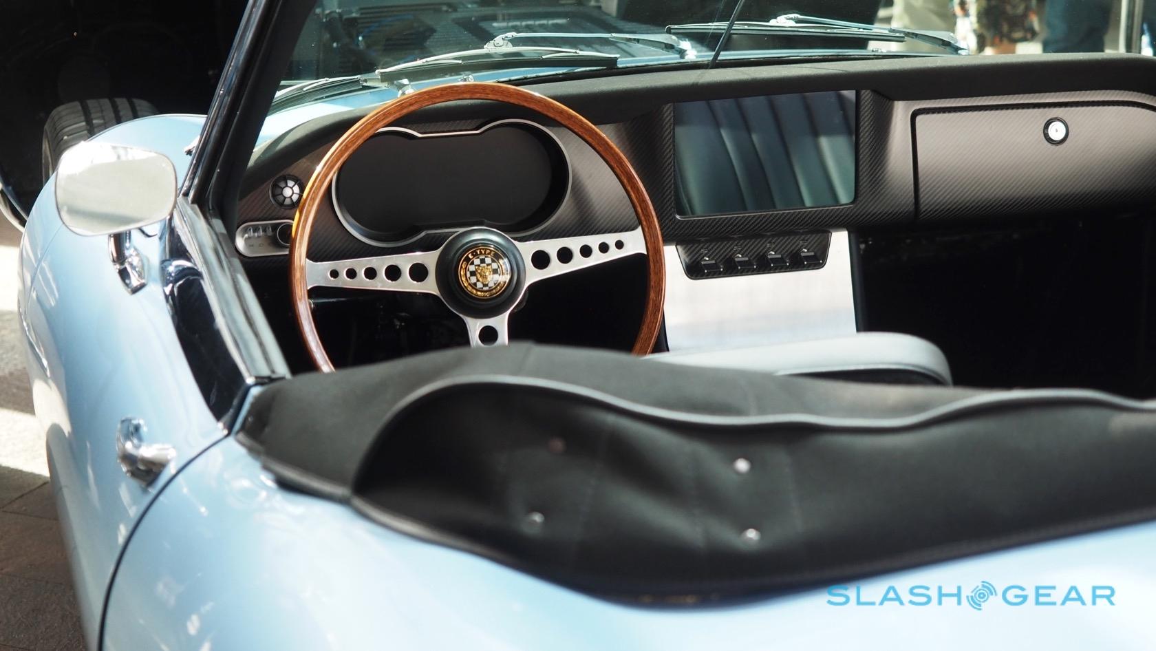 In the center console, there's the rotary controller from modern Jaguars, a little incongruous alongside the slender chromed stem of the original parking brake handle. A bank of toggle switches is reminiscent of the controls found in the E-Type's modern-day equivalent, the Jaguar F-TYPE. It's underneath a touchscreen which gives access to the thoroughly modern infotainment system.