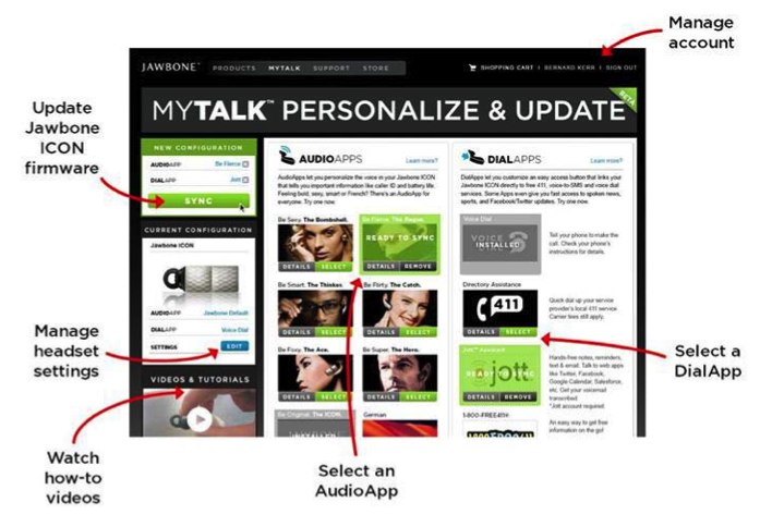 Once you're registered and logged in, you can do more than just check for new firmware. From launch Aliph expect users to be able to use MyTALK to customize the so-called AudioApps – the ICON's voice prompts – not only between different languages (French, German and Spanish) but different personalities such as "flirty", "sexy" or "fierce". There's also DialApps, a more straightforward way to assign a speed dial to the multifunction button; as well as picking from your regular contacts, you can also choose to set one of various directory assistance services together with access to the Jott and Dial2Do subscription-based hands-free assistance services (which offer things like voice-to-SMS and Facebook text-to-speech).