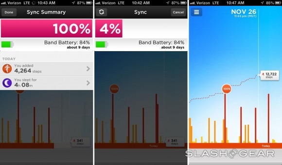 Compared to a Nike+ Fuelband, the UP appeared to be more sensitive to movement: we logged more steps with the Jawbone than we did with Nike's tracker. There's more immediacy to the Fuelband, thanks to its integrated display and wireless connection with the companion app; with the UP we found ourselves synching 2-3 times a day and reviewing our activity, whereas with the Fuelband we checked progress more frequently, often in the midst of activity.