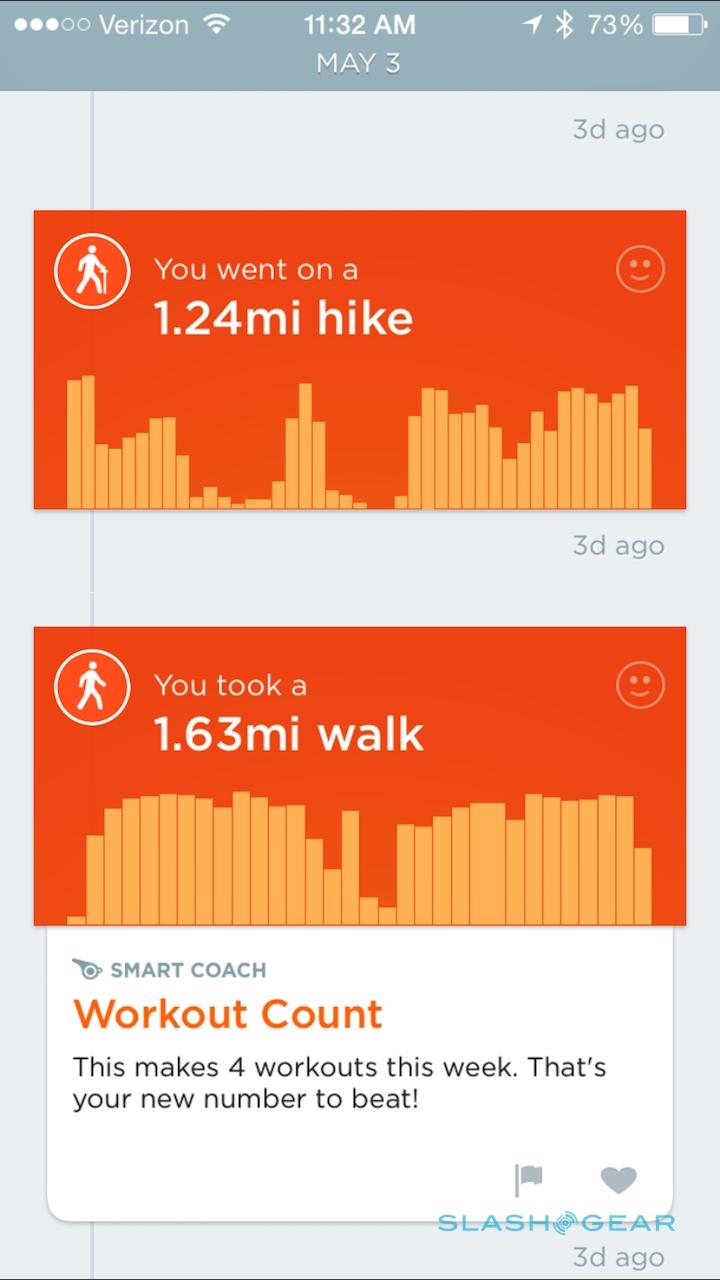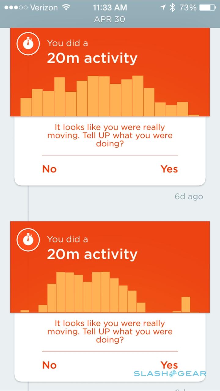 As you might expect, those same core strengths are carried over for UP3. Walk through your normal day and it'll track how many steps you've taken, the distance traveled, and how many calories you've burned. Do something a little more strenuous, and the app pops up a notification asking for confirmation that you were exercising, and then to define what that exercise actually was.