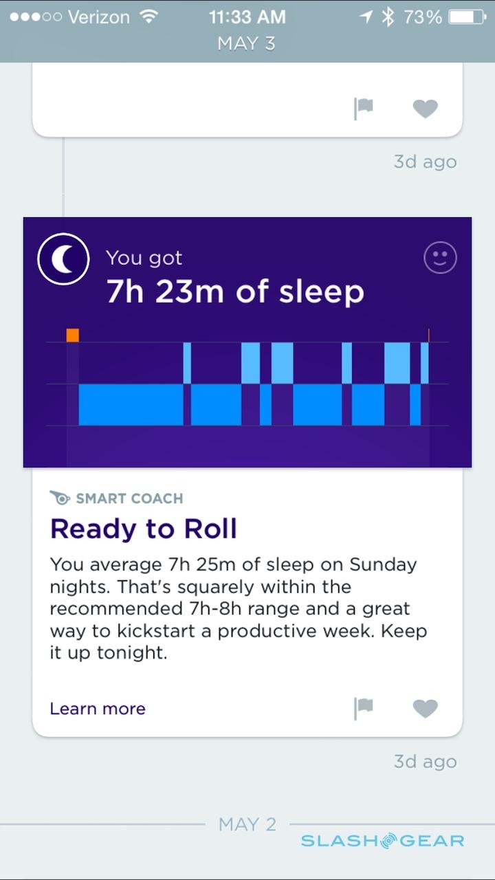 Meanwhile, the Smart Coach begins to try to coax you into a healthier lifestyle. If you're short on steps compared to your typical day, the UP app will pop up a suggestion to get moving; if your bedtime has been irregular, it'll prompt you to get your head down at a more sensible time.