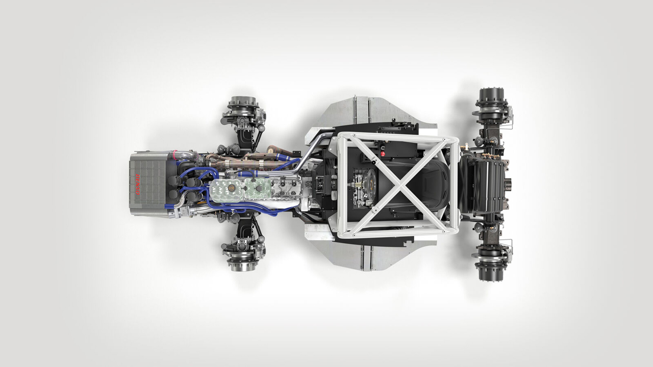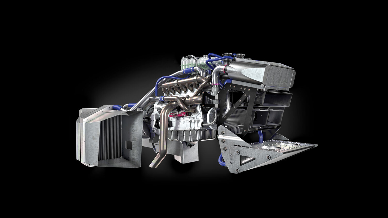 Compared to the stock tractor, the Fastrac Two uses a larger turbo that makes 5.0 bar of boost and an electric supercharger. It also has water in injection, charge-air cooling that slurps air through ice-tanks to reduce intake temperatures by 50C. The exhaust manifold was also revised for improved flow.