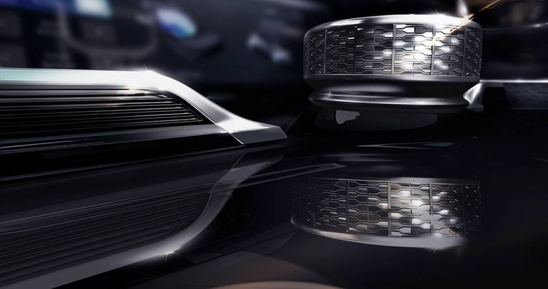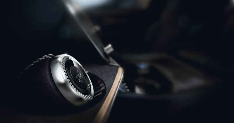 The Start/Stop button, for example, is lovingly wrapped in stitched leather and given a bold metal trim. Matching metal knobs can be seen in the distance, across a swathe of bi-color wood. Elsewhere, there's a seriously impressive looking knob, knurled with an unusual pattern. That could be a gear selector, or it could be a dial to control the infotainment system.