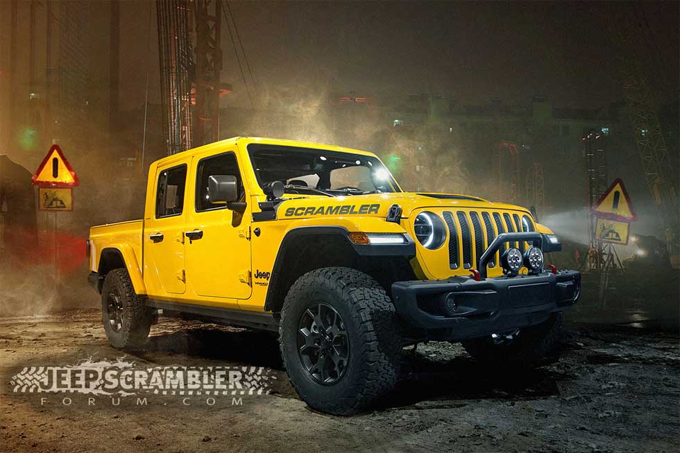 The truck is tipped for a removable top and the renderings with Scrambler on the tailgate are particularly appealing. The Wrangler truck looks particularly good in Hella Yella.