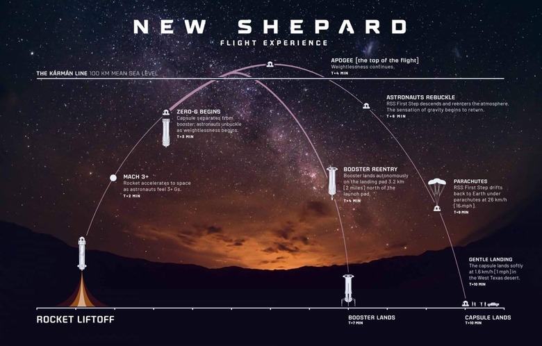 Zero-G will begin from the third minute into flight, and then at some point between and the flight's highest point, or apogee, at four minutes, Bezos and the others onboard will officially pass into space. Gravity will return at approximately six minutes post-launch, with the parachutes deploying at nine minutes, and finally a landing at around 10 minutes after takeoff.