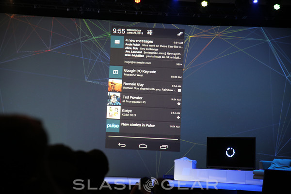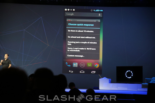 In notifications, we've got the same lovely notification features we've had before, including the swiping away of already read items. Inside notifications for Gmail, Google has included a set of canned responses, such as "I'll be there soon." For TuneIn Radio – and other radio apps in the future – you've got brand new mini controller notifications.