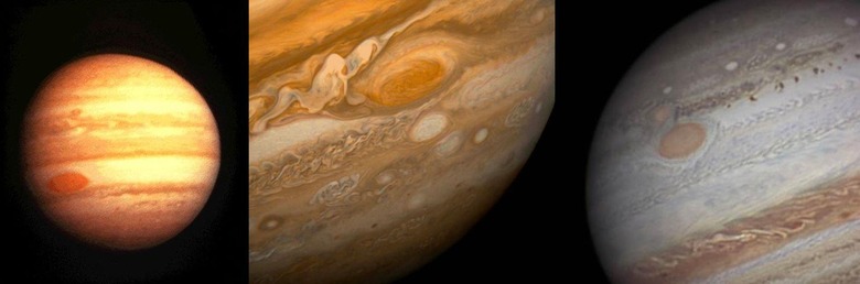 The "Great Red Spot" changed shape over the past several decades. The first image you'll see below comes from Pioneer 10 in 1974, showing a red spot with solid edges and a far more stark appearance compared to its surroundings. The image in the center shows Jupiter's spot photographed by Voyager 1 in 1979.