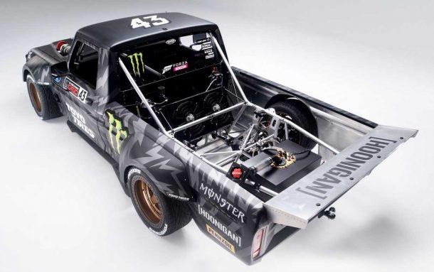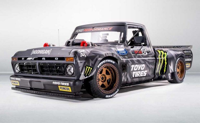 Hoonitruck start life as a 1977 F-150, all that is left of that Ford truck is the body. The rest of the F-150 was replaced with racing parts and a tube frame chassis. The heart of the Hoonitruck is a 914hp Ford Performance EcoBoost V6 engine that is derived from the Le Mans winning Ford GT.