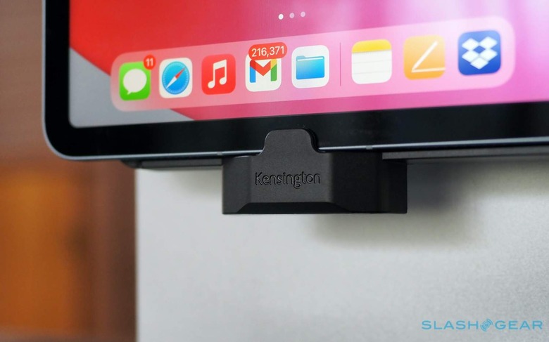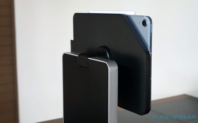 Kensington's answer is a combination of a plastic bracket and magnets. You slot the iPad in USB-C first, and then press it back into the cradle. Two of the sides – those which have the potential to be on the bottom, depending on how the tablet is oriented – have a slightly raised lip, working with the magnets in the back plate to keep it locked in place. A cutout on the rear corner keeps the camera unblocked, and also works as a good place to pull the iPad out of the StudioDock again.